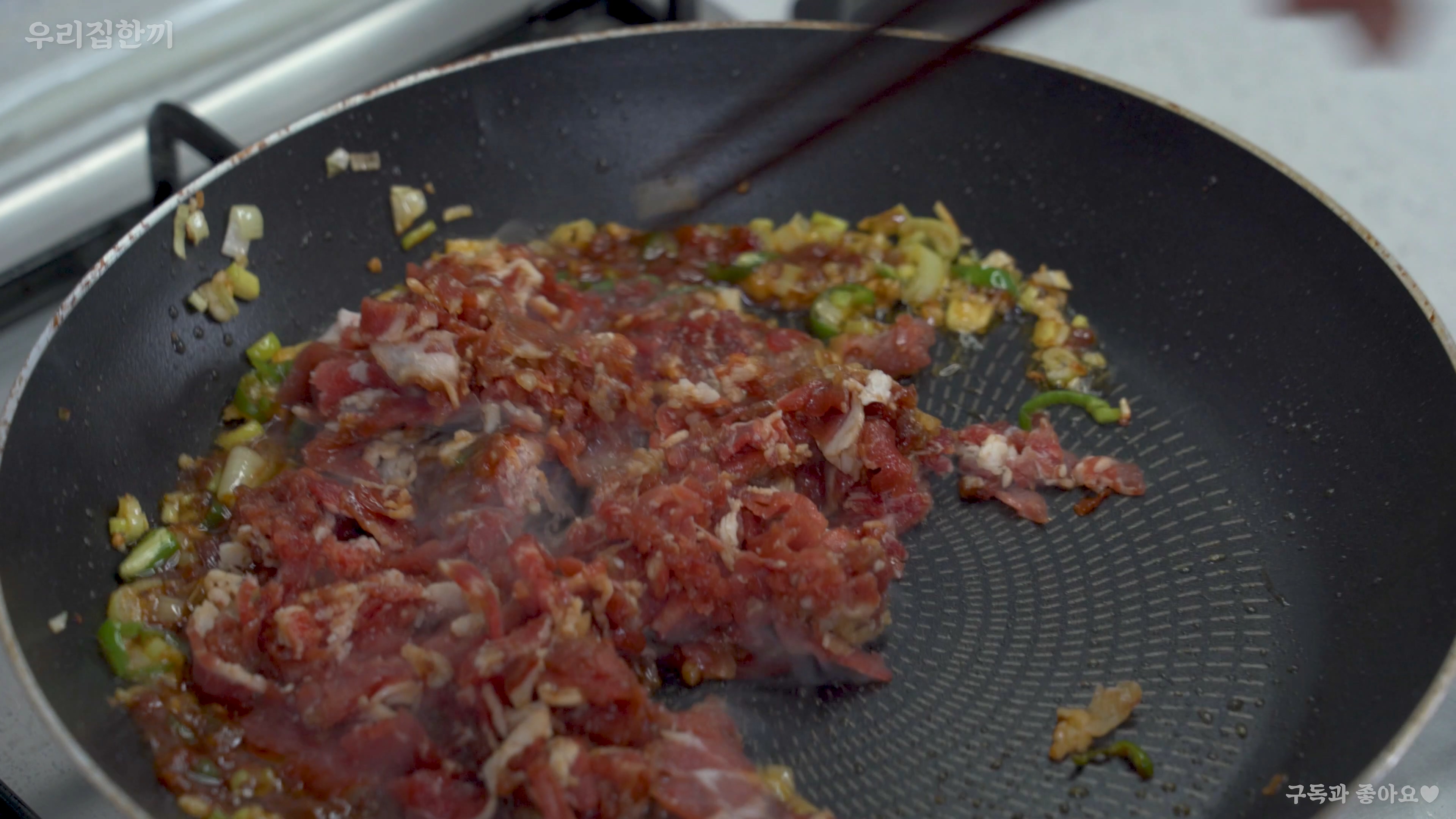 12) 잠시 재워둔 차돌박이를 넣고 다시 볶아주세요.